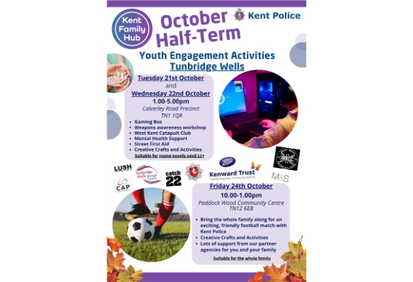 If you are looking for half term activities to keep your teenagers busy, then look no further. Kent Police and partners, including The Family Hub, Tunbridge Wells Borough Council, Catch 22, Kenwards Trust, The Mental Health Resource, The West Kent Catapult Club and many of our local businesses, will be offering a range of engaging activities to promote safety and wellbeing for young people. Plus the best bit is, it's all FREE! We look forward to seeing you there. | ||