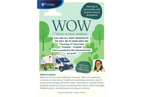Your local Safer Neighbourhood Team will be at Pant Memorial Hall on Dec 4th at 11:00 with the Shropshire Council Winter Outreach Wellbeing van