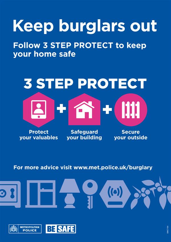 While we will continue to pursue burglars in the area, there are steps you can do to help keep your property safe. Make sure that you: Double lock your door every time you leave the house If you can, move garden furniture or bins away from windows so that thieves cannot use them to gain access. Use laminated glass or security film on ground floor and accessible windows. Use a sash stop if you have sash windows to prevent people opening them enough to climb through. If your windows open outwards, use a key operated lock – check these are locked before leaving the house. Make sure all valuables are out of sight. Keep handbags and keys away from letterboxes or cat flaps. In the evening shut the curtains and leave lights on. Set your burglar alarm Lock your shed or garage Mark, register or record your valuables.
