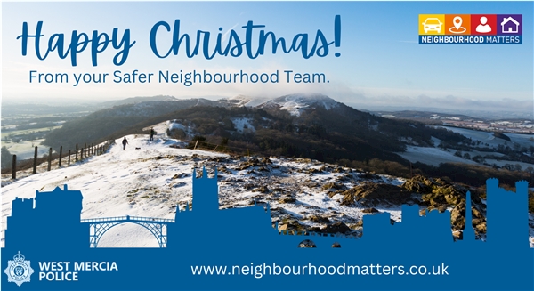 We understand that the festive period is not as joyous for everyone, and that it can be a difficult time of year. If you need a chat, try calling one of the following who are available to listen: For a full list of advice and support, please see: https://www.westmercia.police.uk/advice/advice-and-information/ Your Safer Neighbourhood Team will be working over Christmas and the New Year. We are here for you 24/7, 365 days of the year. If you need us, you can contact us directly by replying to this message and we will get back to you as soon as possible. You can also get in touch via our website: https://www.westmercia.police.uk/ro/report/ocr/af/how-to-report-a-crime/ Or in an emergency please call 999. If you aren’t comfortable contacting us directly, you can pass on information anonymously to the independent charity, Crimestoppers, by calling 0800 555 111 or by visiting their website: www.crimestoppers-uk.org Thank you for your support. Your local Safer Neighbourhood Team and everyone at West Mercia Police wish you a safe and peaceful Christmas, and a Happy New Year! | ||