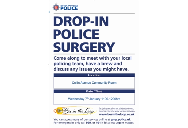 There will be a Crime Surgery on Wednesday 7th January at Collin Avenue Community Room 1100hrs-1200hrs. Come and have a chat with your local officers.