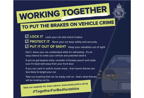 #TogetherForBedfordshire | Our Winter Plan of Action sees us working with partners to keep everyone safe and secure. We know some crimes can rise at this time of year – like burglary, vehicle crime, shoplifting and anti-social behaviour. That’s why we will have extra patrols out in our town centres and our intelligence-led operations will work to make neighbourhoods as hostile to criminals as possible. But we can’t do it alone and you can help us. Report any suspicious activity or information here: https://www.beds.police.uk/ro/report And here are some top tips to keep your vehicle safe. There's more crime prevention advice here: https://www.beds.police.uk/cp/crime-prevention | ||