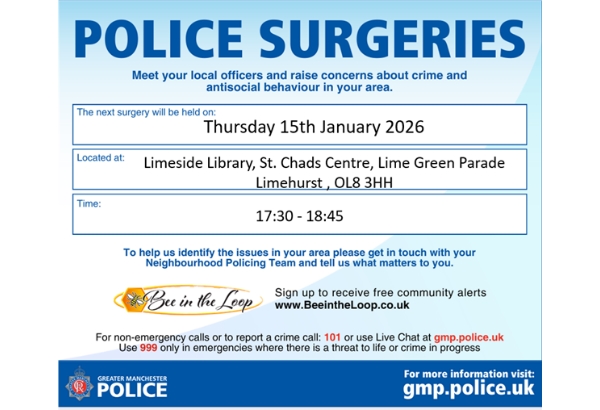 Dear Resident, PCSO’s are holding a Police Surgery on Thursday 15th January 2026 , please pop along and discuss any concerns or any local issues.