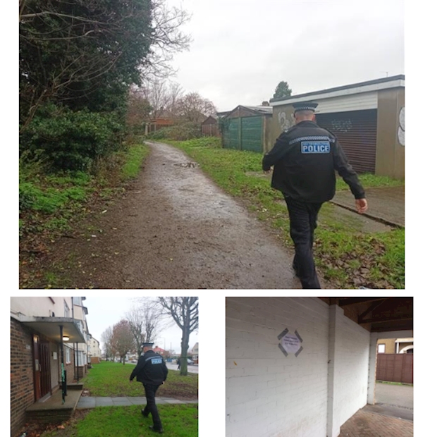 After assisting with a mental health assessment first thing, Lee headed out with Rick this afternoon for anti-social behaviour (ASB) patrols around Barking and Dagenham College (4.14 miles). Hotspots, including Harveys Lane (1.12pm, p) via Valentines Way, the Dagenham Road flats (1.20pm, p) and the Thorntons Farm Avenue alley were visited, along with a check on the Co-op.