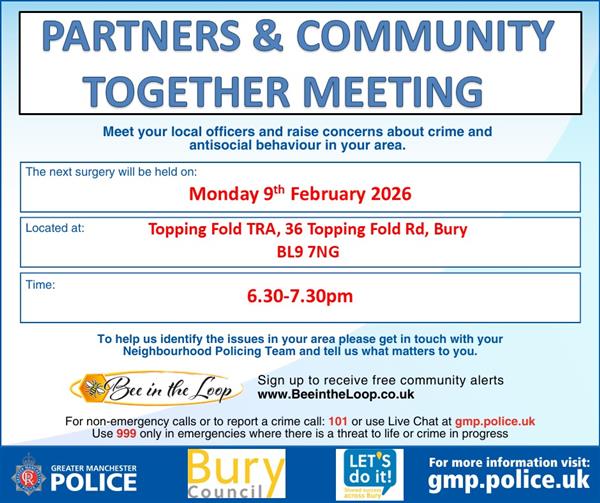 Hello, The East Bury Neighbourhood Team are attending the next Partners & Community Together meeting on the 9th February 2026 , please see the attached poster.