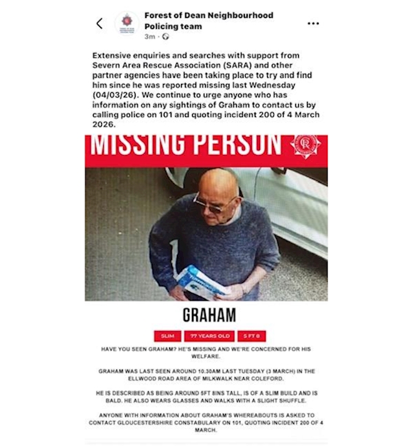 Extensive enquiries and searches with support from Severn Area Rescue Association (SARA) and other partner agencies have been taking place to try and find him since he was reported missing last Wednesday (04/03/26). We continue to urge anyone who has information on any sightings of Graham to contact us by calling police on 101 and quote incident 200 of 4th March 2026