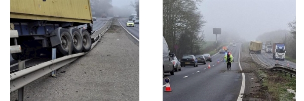Police were called at 7.10am on Friday 20 March to reports that an HGV that was travelling westbound, had collided with the central reservation and gone into the eastbound carriageway.