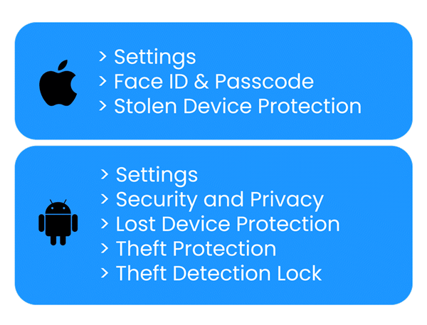 Activate anti-theft protectionWhichever phone you use, it is quick and easy to activate your phone’s in-built anti-theft protection. For iPhone users, Stolen Device Protection provides an additional level of security when someone tries to access sensitive features or settings from an unfamiliar location by requiring Face ID. Android users should enable Theft Detection Lock which uses sensors to detect motion patterns that suggest theft (like sudden snatching) and can lock your device immediately.
