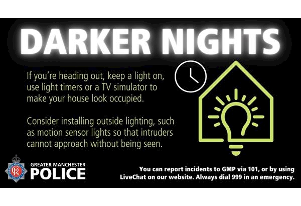 After a recent rise in burglaries in the area , please see the following information. #DarkerNights | Light timers are a great way to make burglars think your home is occupied. Time them to come on and off intermittently as it goes dark to give the impression somebody is at home. Read more advice here: https://www.gmp.police.uk/cp/crime-prevention/protect-home-crime/