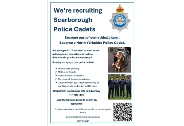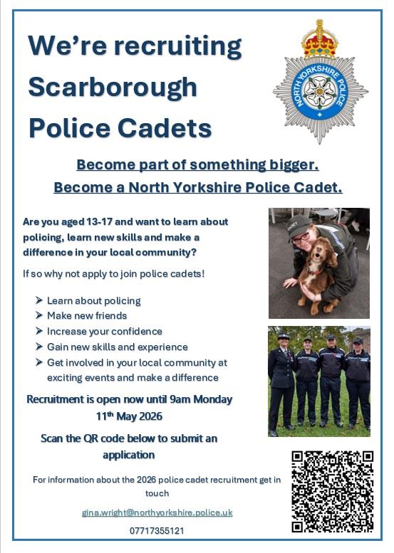 Scarborough police cadets unit is recruiting now for September 2026 start. Please share this with any young people aged 13-17yrs who may be interested in joining us.