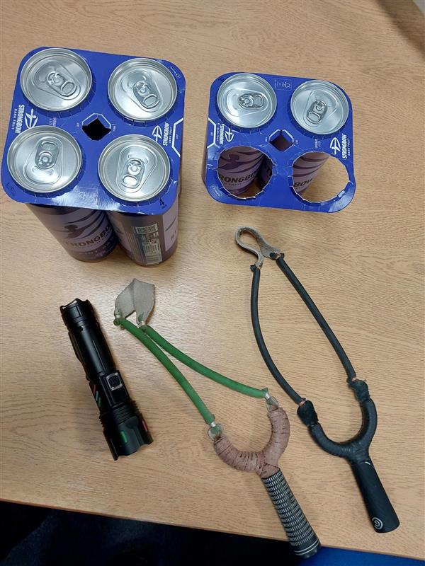 Following on from the work we are doing in relation to shoplifting within the town, yesterday we ran a joint operation with security staff in one of the shops. This provided some good results. Two suspects were stopped by security staff and police and dealt with for shoplifting, another from earlier in the day has been identified, and will be soon dealt with. This brings the total number of individuals identified to 20 since starting a specific plan on this issue around a month ago. As well as the shoplifters being dealt with, an eagle eyed member of staff spotted something suspicious outside one of the stores. Thanks to this member of staff's vigilance two catapults, one torch and some alcohol was seized.