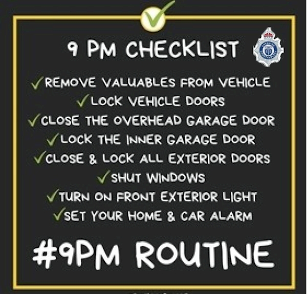 The #9PMroutine is a nightly reminder to residents to remove valuables from their vehicles, lock their vehicle doors, lock the doors to their houses, turn on exterior lights and activate all alarms and security systems.
