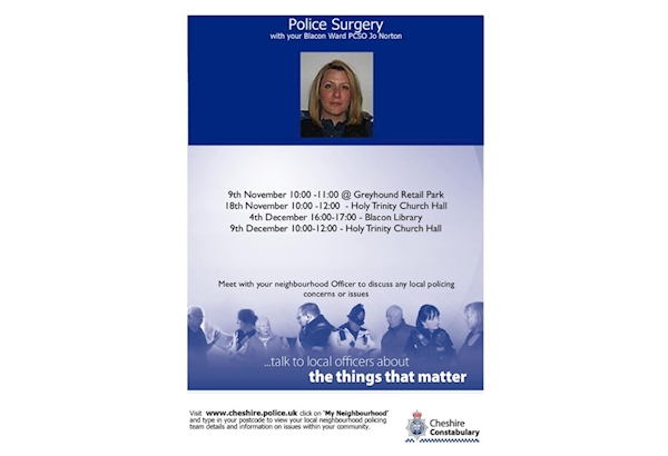 Your local Safer Neighbourhood Team will be at Holy Trinity Church Hall at Norris Road, Blacon on 18th November at 10:00am.