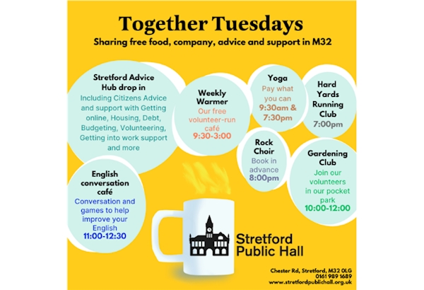 Tuesday 30th September please come down and have your say of the fradft Trafford Local Plan. There are some free homemade refreshments from Thermonix. Yoga, job club and their advice hub, ESOL conversation, digital support, running and singin. Sharing food, support and company. This happens every Tuesday throughout the year. | ||
