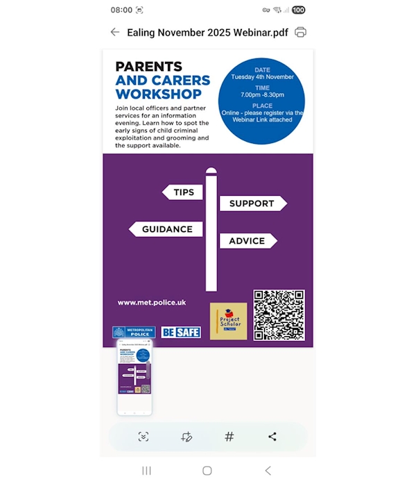 Good morning all, On TUESDAY 4 NOVEMBER 2025 at 7pm there will be an ONLINE WEBINAR Worshop for Parents and Carers on how to spot the signs of child exploitation and grooming. Please see the attached flyer for the QR code. | ||