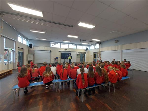 The team had been invited to complete assemblies for their Key stage 1 students (Infants) and Key Stage 2 students (juniors) on Road Safety in the school hall.