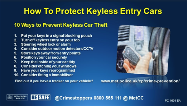 I wanted to provide an update regarding the theft of motor vehicles, which members around this area have highlighted as an issue of concern on the Met Engage priority survey. Motor Vehicle Crime We know that people can be concerned about the personal and financial impact of having their vehicle stolen, which is why we will pursue and arrest those who break the law. Please consider taking the following steps to keep your vehicle safe: