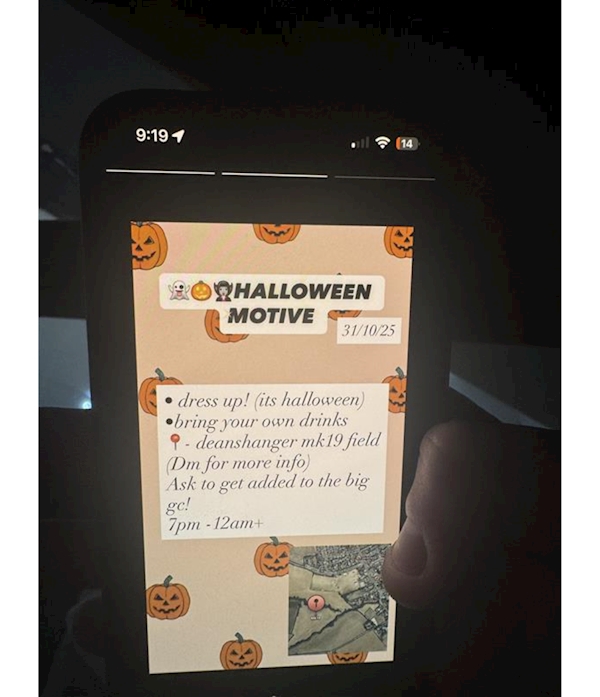 Hello, We have become aware of the above post about a forthcoming event near to Deanshanger on the 31st October 2025. We have spoken to the farmer today and can confirm that this is an unlicensed and unauthorised event. We ask parents to thr vigilant, and only allow young people to attend licenced and permitted events over the Halloween and Bonfire Night period. Northamptonshire Police will be conducted patrols as part of Operation Pumpkin and Operation Thirsk to ensure everyone's safety during this period. Kind Regards, Matthew Taylor South Northants Neighbourhood Team