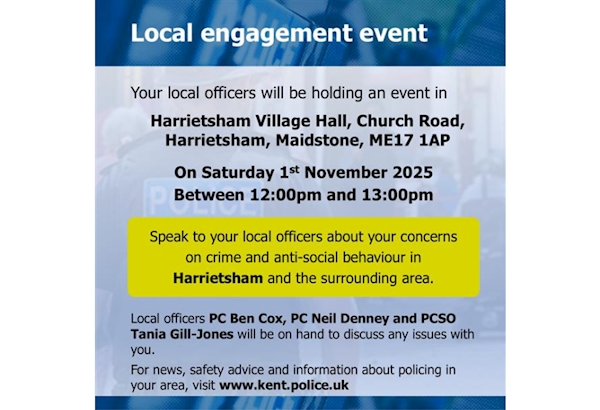 Your local Beat Officers PC Ben Cox, PC Neil Denney and PCSO Tania Gill-Jones will be holding a Drop In Engagement Surgery at Harrietsham Village Hall, Church Road, Harrietsham, Maidstone, ME17 1AP on Saturday 1st November 2025 between 12:00 hours and 13:00 hours for residents of Harrietsham and the surrounding area.
