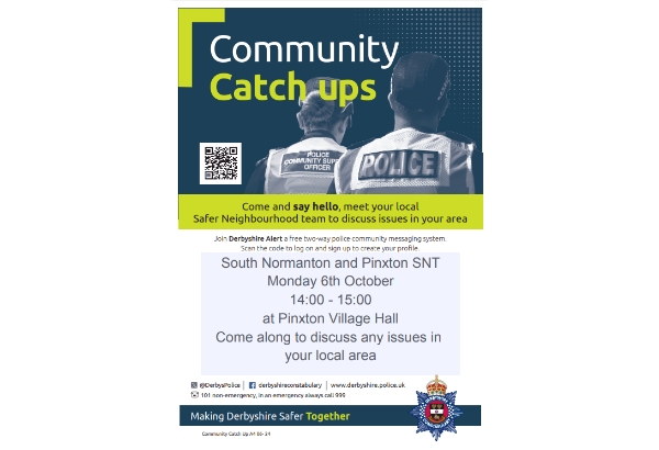 Your local Safer Neighbourhood Team will be at a Community Catch Up Event Today at 14:00 at Pinxton Village Hall Please take this opportunity to raise any concerns you may have and to find out what we are doing to tackle the issues that matter to you.