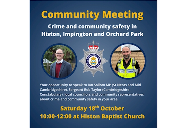 Dear Resident, I will be joining MP Ian Sollom, local councillors and community representatives on Saturday, 18 October to talk about crime and community safety in Histon, Impington and Orchard Park. The event will be held between 10am and 12pm at Histon Baptist Church. All are welcome to attend. We hope to see you there. Kind Regards, Sergeant Rob Taylor South Cambridgeshire Neighbourhood Team | ||