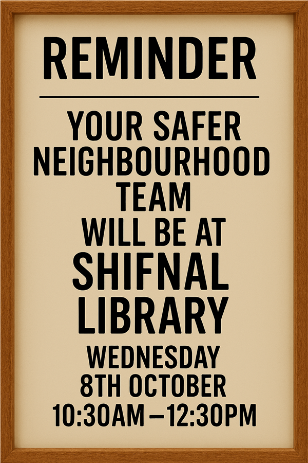 REMINDER: Safer Neighbourhood Policing Session – Shifnal Library Your Shifnal and Albrighton Safer Neighbourhood Team will be holding a community policing session at: Shifnal Library 10:30am – 12:30pm Wednesday 8th October