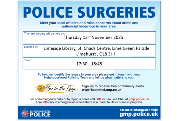 Your local PCSO's are holding a police surgery on Thursday 13th November at Limeside Library, St. Chads Centre, Lime Green Parade, Limehurst , OL8 3HH from 17:30 - 18:45. Please take this opportunity to raise any concerns you may have and to find out what we are doing to tackle the issues that matter to you. Everyone is welcome and it would be great to see you there.