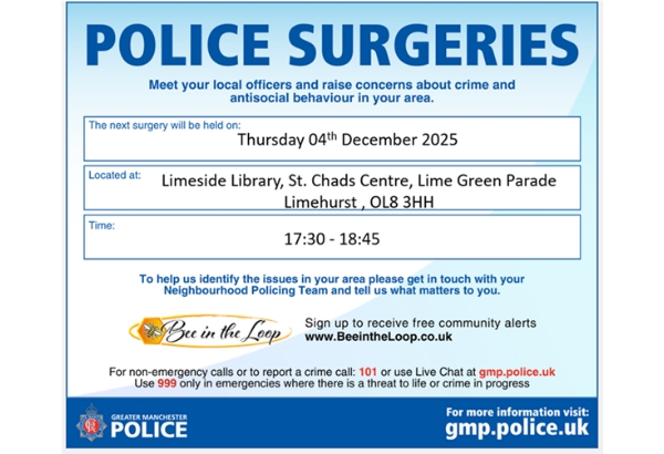 Your local PCSO's are holding a police surgery on Thursday 4th December 2025 at Limeside Library, St. Chads Centre, Lime Green Parade, Limehurst , OL8 3HH from 17:30 - 18:45. Please take this opportunity to raise any concerns you may have and to find out what we are doing to tackle the issues that matter to you. Everyone is welcome and it would be great to see you there.