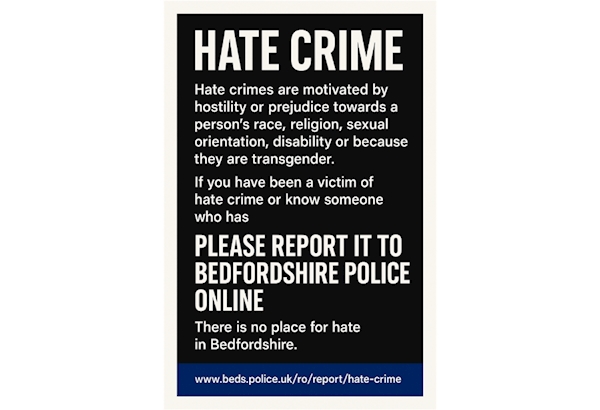 Do you know what a Hate Crime is? Hate crimes are serious offences that target individuals or groups based on characteristics such as: Hate crime can include verbal abuse, threats, harassment, physical assault, or damage to property — as long as the victim or anyone else believes it was motivated by prejudice. Key Points: If someone believes an incident was motivated by prejudice or hostility towards any of these characteristics — even if it's just a perception — it can be classified as a hate crime. Reporting these incidents helps protect communities and ensures that appropriate action is taken. Please report hate crimes to Bedfordshire Police. Thank you.