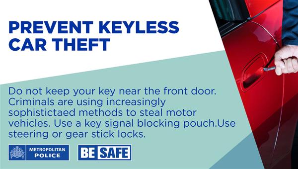 I wanted to provide an update regarding the theft of motor vehicles, which members around this area have highlighted as an issue of concern on the Met Engage priority survey. Dear Residents, We know that people can be concerned about the personal and financial impact of having their vehicle stolen, which is why we will pursue and arrest those who break the law. Please consider taking the following steps to keep your vehicle safe: