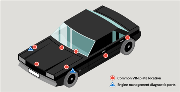 8. Before owning, check for cloningChanging the identity of a vehicle, known as vehicle cloning, can be as simple as adding stolen number plates. When buying a vehicle, always check the DVLA V5 document and make sure the Vehicle Identification Number (VIN) on the vehicle is the same as on the document. Make sure you check more than one of the VINs as well as the engine numbers on the vehicle (see diagram). Check a used vehicle you’re buying. 9. Secure your portMany modern vehicles are fitted with engine management diagnostic ports, which can unlock and start your vehicle. If your vehicle has this type of port, consider fitting a lockable cover. Useful linksFor more information about police preferred specification products that help to reduce the chances of vehicle crime please visit: | ||