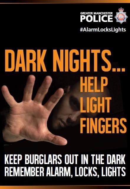 If you see anything suspicious near your home or your neighbours, you can get in touch with us on 999 (if it is ongoing) or 101 / www.gmp.police.uk if it is not an emergency.