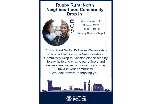 Rugby Rural North SNT officers from your local Safer Neighbourhood Team will be at Wolvey Baptist Chapel on Wednesday 15th October 16:00 - 18:00hrs and we look forward to meeting you and understanding any concerns or priorities you have for policing in your neighbourhood. If you see us, please feel free to stop us and say hello.