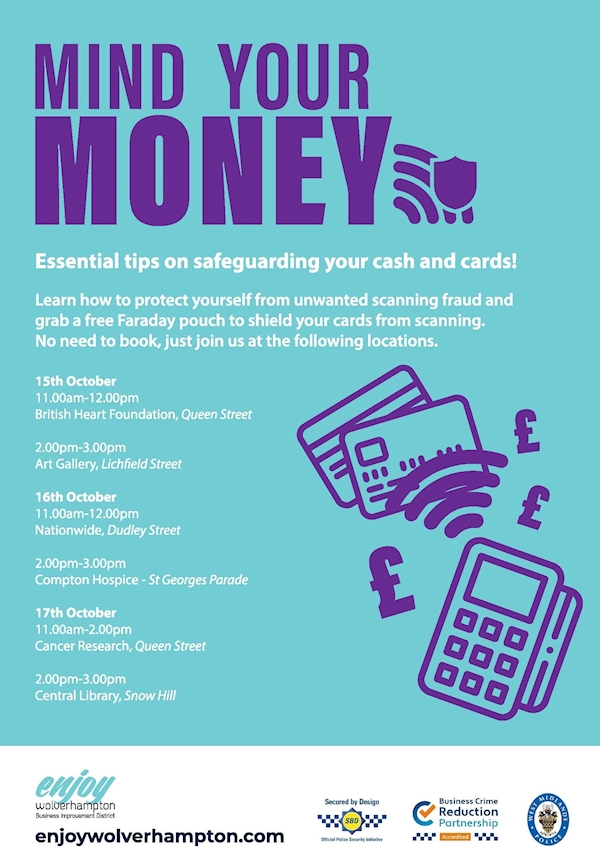 🔒💳 Mind your Money! Join us from October 15th to 17th for vital tips on protecting your cash and cards. Discover how to shield yourself from scanning fraud and receive a FREE Faraday pouch to keep your cards safe! Don’t miss out on these informative sessions at locations below. Mark your calendars and let’s secure your finances together! 💼✨