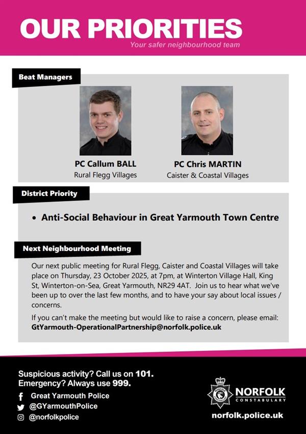 Just a quick reminder about our upcoming Neighbourhood Meeting for Rural Flegg, Caister, coastal and surrounding villages: