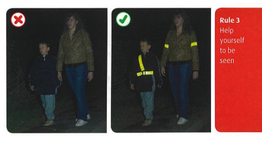 AS THE NIGHTS DRAW IN ADVICE Rules for pedestrians from the Highway Code General guidance (edited) Pavements including any path along the side of a road should be used if provided. If there is no pavement, keep to the right-hand side so that you can see oncoming traffic. You should take extra care and be prepared to walk in single file, especially on narrow roads or in poor light keep close to the side of the road Help other road users to see you. Wear or carry something light-coloured, bright or fluorescent in poor daylight conditions. When it is dark, use reflective materials (e.g. armbands, sashes, waistcoats, jackets, footwear). which can be seen by drivers using headlights up to three times as far away as non-reflective materials.