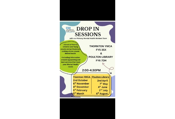 Please see below a poster of some drop-in sessions organised by Lancashire and South Cumbria NHS Foundation with the Primary Mental Health Workers Team at Thornton YMCA.
