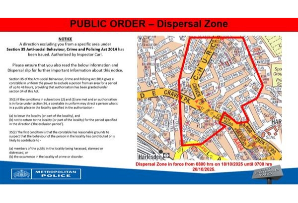 Just for everyone’s awareness S.35 Dispersal covering NW10 area around Fortunegate Road and Craven Park Road has been authorised (see attached map). The dispersal will run from 0800 hours on 18/10/2025 until 0700 hrs on 20/10/2025. | ||