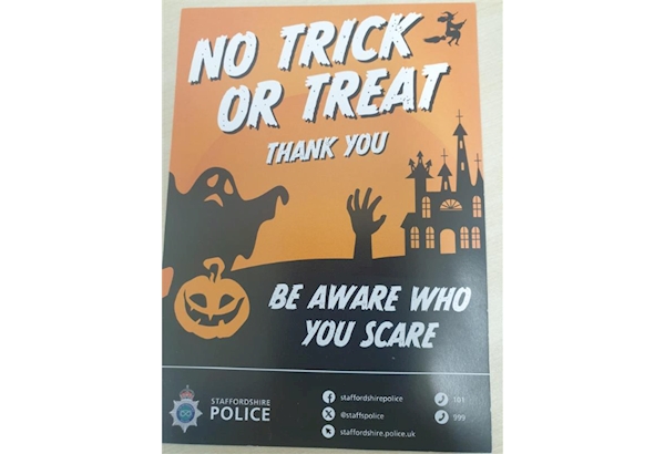 Good Morning, I will be at the Hub on Fegg Hayes Road between 10.30 and 11.30 this morning. I have a few trick or treat flyers that people can take if they would like to deter trick or treaters this Halloween. Feel free to call in for a cuppa and a chat. If you're unable to make this morning I will leave some flyers in reception.