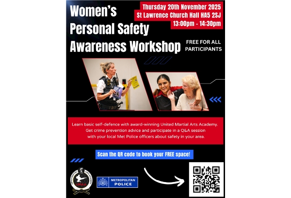 We’re pleased to invite you to a FREE Personal Safety Awareness Workshop exclusively for women, taking place locally next month. This is a valuable opportunity to learn practical safety tips and basic self-defence techniques in a supportive environment. Workshop Details: Date: Thursday, 20th November 2025Time: 13:00 – 14:30Venue: St Lawrence Church Hall, 2A Bridle Road, Eastcote, Pinner, HA5 2SJWho: Women only (Please note: attendees aged 12–17 require parental permission as outlined on the registration page)What to Expect: A basic self-defence class delivered by UMAA (non-police, male instructors)Local police officers available after the session to discuss safety concerns and share crime prevention adviceA complimentary goody bag with personal safety items (e.g., torch, purse bells) and useful materialsImportant: Spaces are limited due to venue capacity, so advance booking is essential. 👉 Reserve your place here: https://www.umaa.club/booking-calendar/personal-safety-awareness-workshop-free-1?utm_medium=page_links Please find the promotional material for the session attached. We encourage all eligible residents to take advantage of this free initiative aimed at empowering our community and enhancing personal safety.