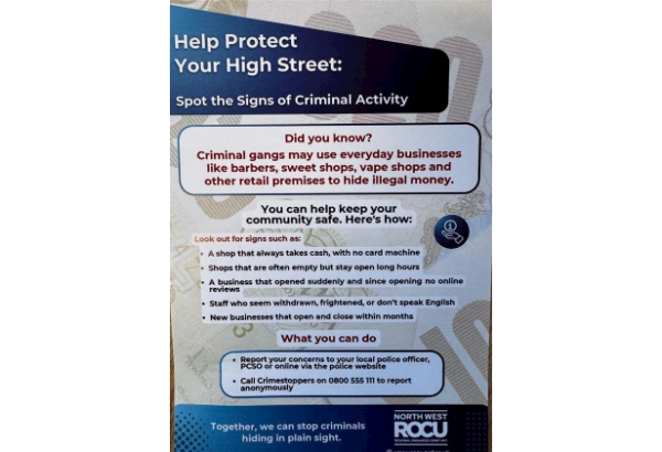 Hi Resident, Did you know that criminal gangs may use everyday businesses like barbers, sweet shops, vape shops and other retail premises to hide illegal money. Can you spot the signs of criminal activity? Look out for: A shop that always takes cash, with no card machineShops that are often empty but stay open long hoursA business that opened suddenly and since opening no online reviewsStaff who seen withdrawn, frightened, or don't speak EnglishNew businesses that open and close within monthsReport any concerns you have by either, Ringing 101Go to the main GMP website at www.gmp.police.uk and use the Live Chat optionGive information 100% anonymously to Crimestoppers on 0800 555 111, or at Independent UK charity taking crime information anonymously | CrimestoppersRegards, The Hyde Godley Team.