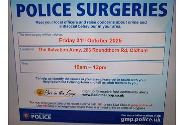 St Mary’s Drop In Police Surgery Friday 31/10/25 Venue: The Salvation Army, Roundthorn Road , Oldham Time:10am– 12pm St Mary’s Policing Team would like to invite residents along to this Drop in Surgery to give you the opportunity to have your say with regards to any issues or concerns that you may have in the community. It is important to us that your voice is heard, and it will give you the opportunity to meet with our Policing Team.