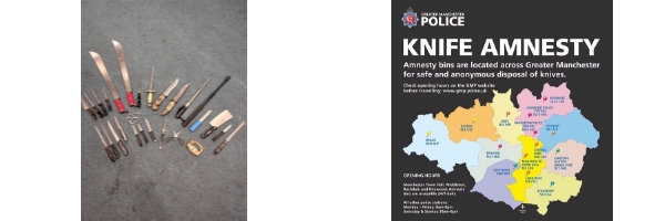 Knives can be safely and anonymously deposited in amnesty bins across Greater Manchester. Many knives are held in innocence or ignorance of their illegality. The Forever Amnesty gives members of the public the chance to dispose of a knife anonymously with no questions asked, by simply depositing it into the amnesty bin at their local police station. Those surrendering knives are not required to give any personal details and will not face prosecution for carrying them. At the beginning of the 2020, GMP launched the Forever Amnesty following the overwhelming success of September 2019's knife amnesty, and in further efforts to reduce knife crime across Greater Manchester. Thousands of knives have been deposited in the bins since the launch, which is a fantastic result for Greater Manchester, as any knife deposited is one less on our streets, and more importantly, one less that can't be used as part of a crime. We'd like to take this opportunity to thank the public of Greater Manchester for supporting the Forever Amnesty. Thanks to this support, the campaign continues to be a success. Above is a map showing the location of your nearest bin. These are here throughout the year and knives can be deposited at a convenient time for you without any questions asked.