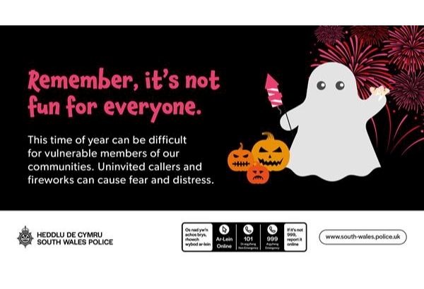 Pumpkin-carving, fancy dress and spectacular firework displays; Halloween and Bonfire Night are often highlights in the family calendar. But with a small minority seeing the autumnal events as an excuse to act in an antisocial manner, the period can leave many in our communities feeling anxious, intimidated and fearful. With that in mind, South Wales Police will once again be supporting Op Bang, helping our communities to enjoy the festivities safely while asking them to remember that Halloween and Bonfire Night are Not Fun For Everyone.