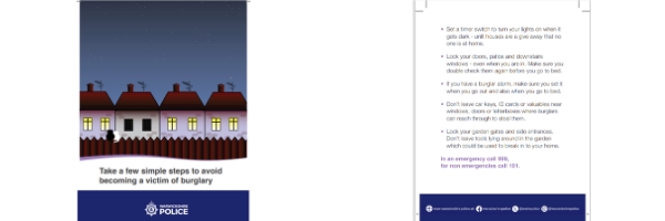 Recently in the early hours of 4th November there were a few attempted burglaries that occurred on the ASPS estate near to Bishops Tachbrook, and in Barford. With this is mind we are sending out some helpful crime prevention information. If anyone has any information regarding the offenders please get in touch via 101 or email us on sntwarwickruralwest@warwickshire.police.uk For other online crime prevention please visit - http://www.warwickshire.police.uk/cp/crime-prevention Regards Warwickshire Rural West Safer Neighbourhood Team