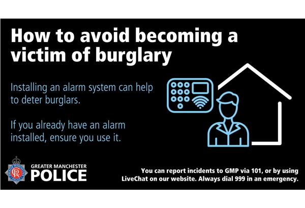 Burglary - Crime prevention message. Having your home broken into and property being stolen is extremely upsetting. Please be vigilant. Please ensure security lighting is effectively positioned and working and any CCTV you may have installed covers access points to your properties/vehicles in particular. Anti-lock snaps are effective in preventing and stalling offenders also. Use timer switches on lamps to give the impression somebody is at home or keep a light on in the evening if you go out. Check all doors and all windows are locked and secure, including those upstairs, before you go out or go to bed. Please get in touch with police by calling 101 or the GMP website using the report it tab should you have any CCTV relating to burglaries, vehicle crime and suspicious circumstances.