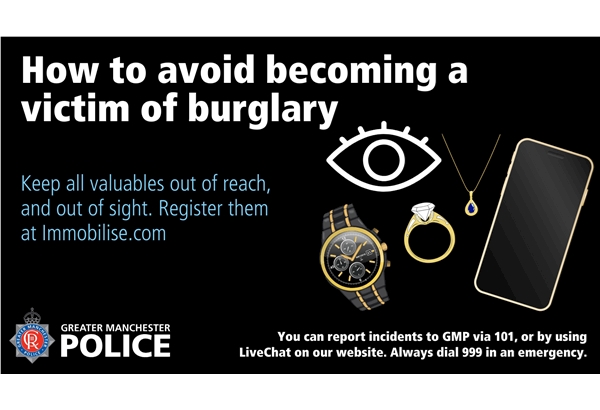 Burglary - Crime prevention message. Having your home broken into and property being stolen is extremely upsetting. Please be vigilant. Please ensure security lighting is effectively positioned and working and any CCTV you may have installed covers access points to your properties/vehicles in particular. Anti-lock snaps are effective in preventing and stalling offenders also. Use timer switches on lamps to give the impression somebody is at home or keep a light on in the evening if you go out. Check all doors and all windows are locked and secure, including those upstairs, before you go out or go to bed. Please get in touch with police by calling 101 or the GMP website using the report it tab should you have any CCTV relating to burglaries, vehicle crime and suspicious circumstances.