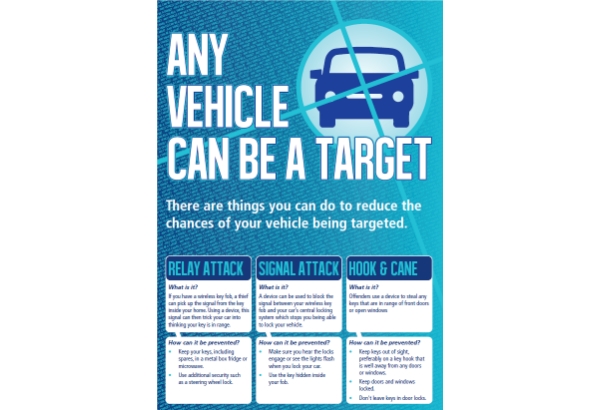 Vehicle Crime prevention message. Having your vehicle stolen is extremely upsetting. Please be vigilant.
