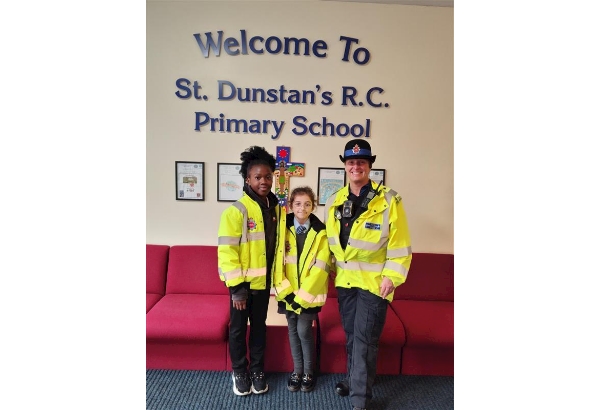 PCSO Lisa was out with the junior PCSO's at St Dunstan's primary yesterday afternoon , advising parents and carer's about parking and safety of the children around school area at peak times.