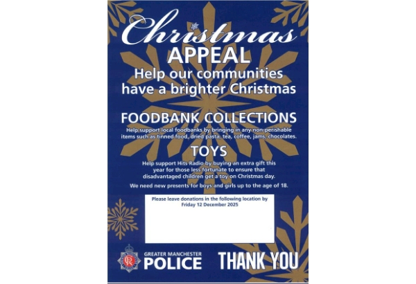 Help our communities have a brighter Christmas. We are supporting Hits Radio and Cash for Kids with their Mission Christmas Hits Radio and Cash for Kids Members of the public can leave donations at Oldham Police station front desk.